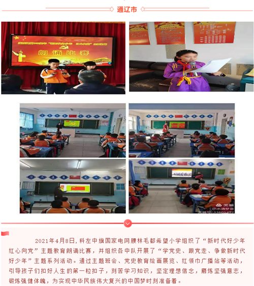 按照自治区团委党史学习教育活动的统一部署,内蒙古青基会第一时间组织动员全区希望小学及受助青少年,通过主题班会、观看红色电影、参观革命旧址、社会观察和亲身实践等形式开展“学党史、强信念、跟党走”学习教育活动,帮助广大青少年感悟党领导人民建设祖国的伟大成就,教育引导受助青少年牢记党恩,常记社会帮扶的温暖,增强自尊心、自豪感、自信心,勇于实践,弘扬奋进精神,努力成长为担当民族复兴大任的时代新人。