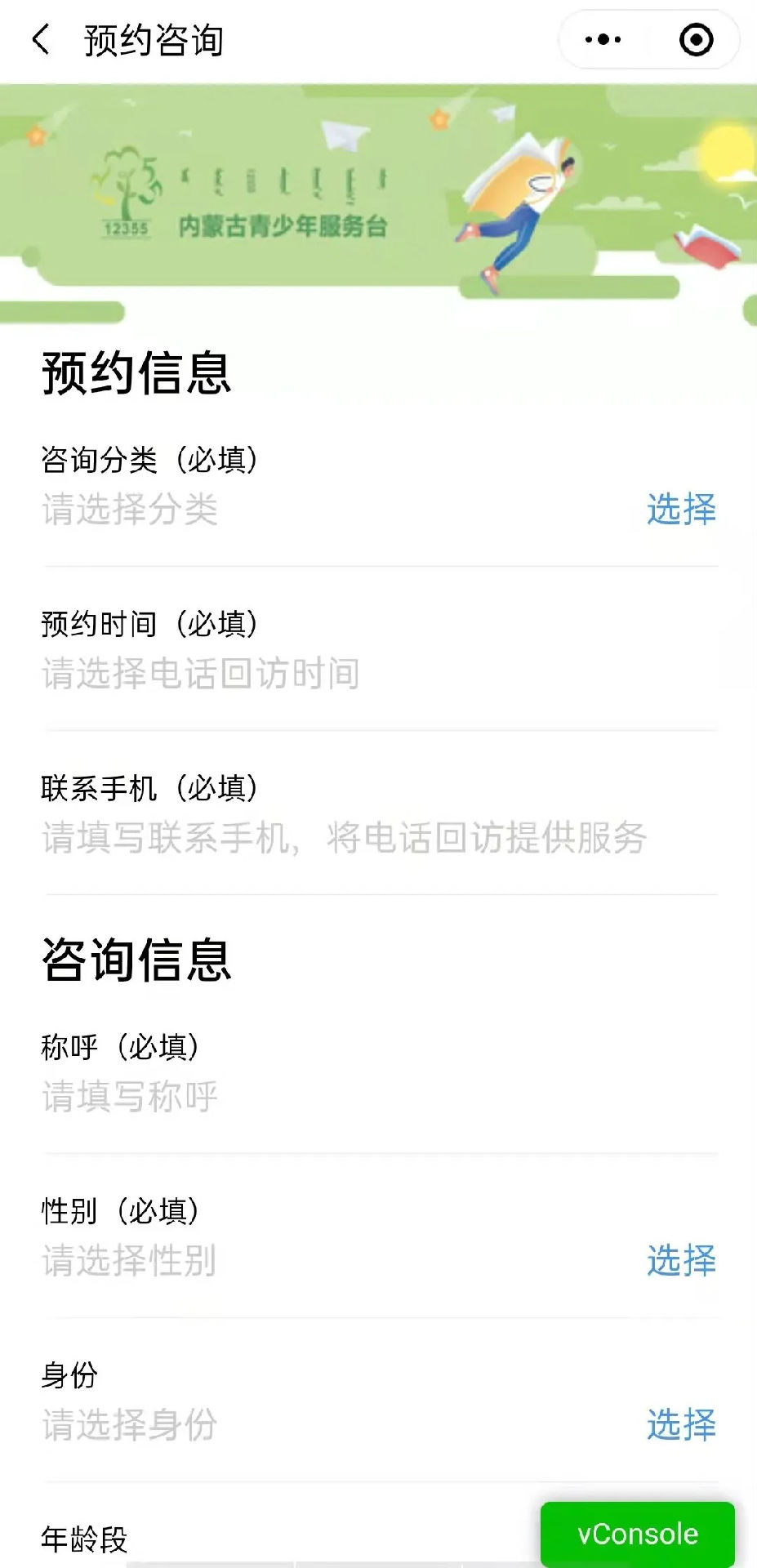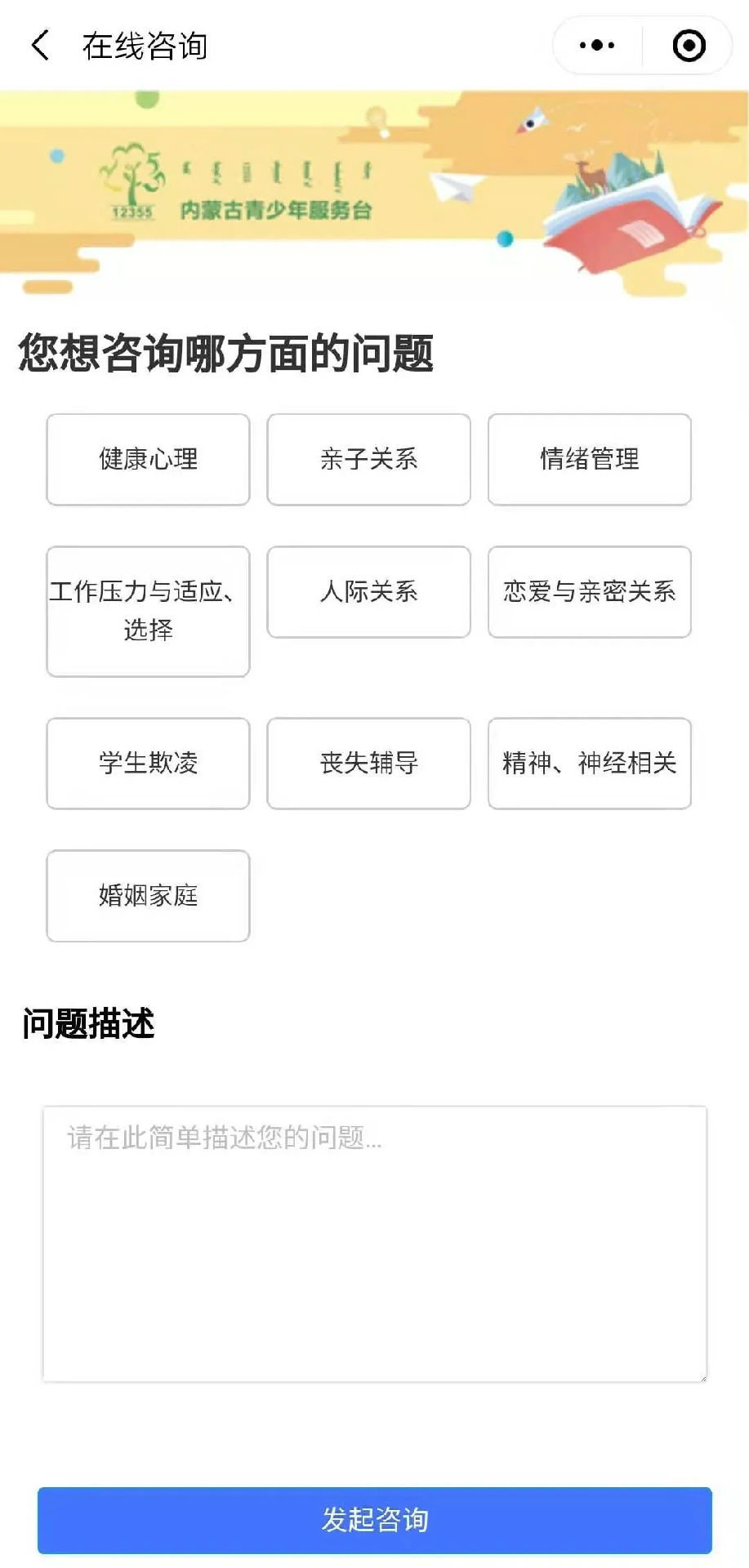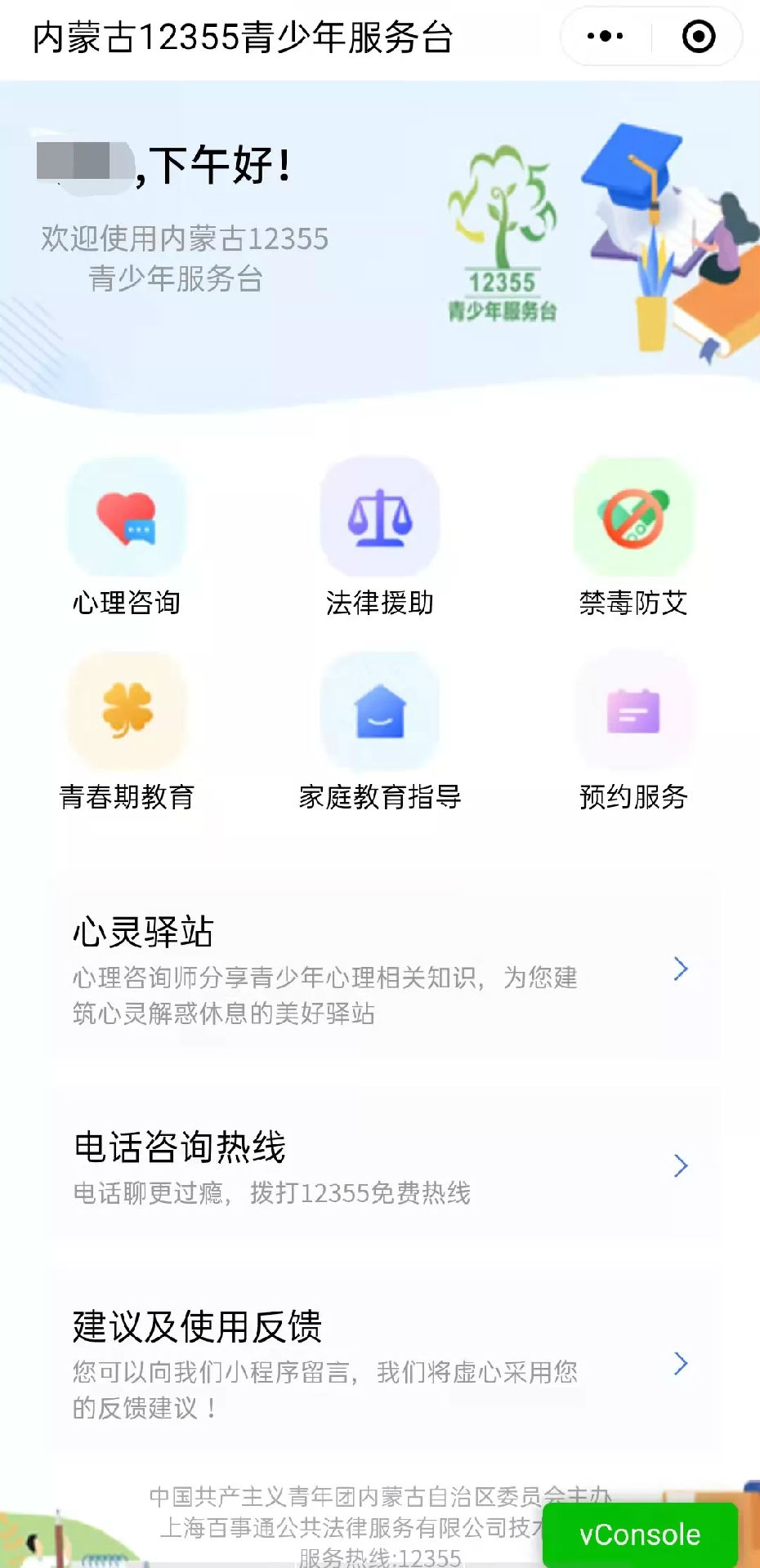 内蒙古12355青少年服务台推出微信小程序应用,为青少年提供就在身边的贴心服务。请在微信搜索“内蒙古12355青少年服务台”小程序进行添加。
