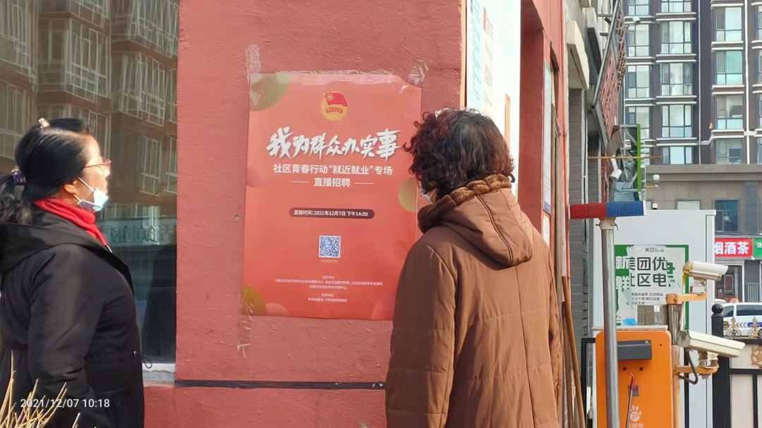 本期直播招聘结合“青年志愿者社区青春行动”,为呼和浩特市祥园社区、新华园社区、兴康社区、创业社区、永泰社区、丁香苑小区等试点社区有就业需求的群众,提供距离社区约5km以内的工作岗位,为社区群众搭建就近、便利的岗位招聘平台。各试点社区工作人员通过社群推广、张贴海报等方式宣传、发动有求职意愿的群众关注、参加活动。