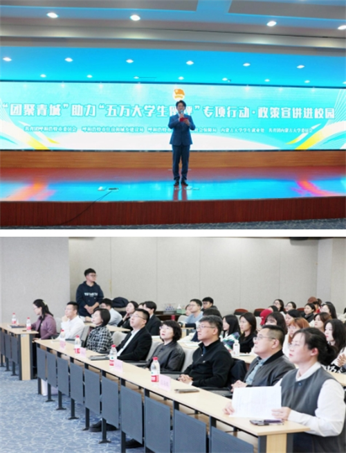 为了助力“五万大学生留呼”专项行动,提升首府城市人口能级,展示青年发展型城市建设试点工作成效,11月14日,团市委联合市人社局、市住建局走进我校,开展“团聚青城”助力“五万大学生留呼”专项行动·政策宣讲进校园活动。团市委书记张宇峰、副书记刘昌、我校团委书记周琳娟、学生就业处副处长温海鹏,以及我校优秀青年学生代表共200余人参加了本次活动。