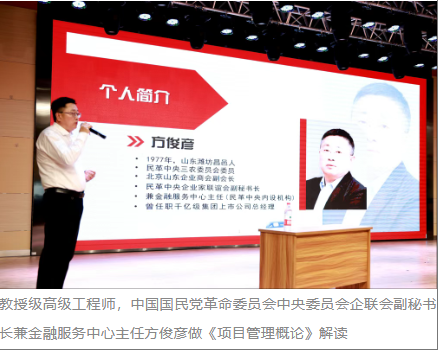 教授级高级工程师,中国国民党革命委员会中央委员会企联会副秘书长兼金融服务中心主任方俊彦通过《项目管理概论》课程,系统讲解项目全周期管理方法,结合自身工作中的实际案例,为青年学子提供了实用的职业技能指导。