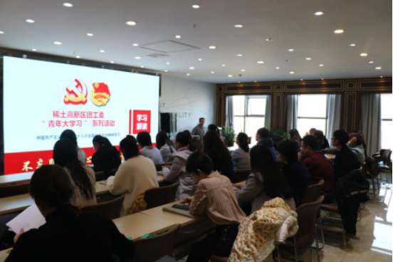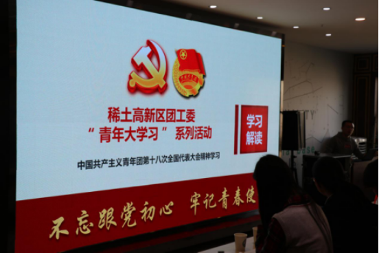 2018年11月16日,为深入学习领会习近平总书记在同团中央新一届领导班子成员集体谈话时的重要讲话精神,切实抓好团的十八大精神的学习宣传贯彻工作,进一步推动“青年大学习”行动落实落细见成效,迅速在全区广大团员青年中掀起学习热潮。稀土高新区团工委在稀土高新区青年创新创业基地开展了“青年大学习”系列活动之“不忘跟党初心 牢记青春使命”的学习活动。稀土高新区各基层团干部到场参与学习。