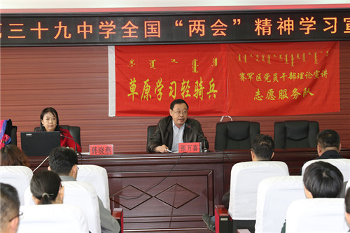 为深入学习贯彻落实2019年全国“两会”精神,按照自治区党委、市委的安排部署,2019年4月1月下午,呼和浩特市“草原学习轻骑兵”宣讲小分队走进呼和浩特市第三十九中学,将习近平总书记在全国“两会”上的重要讲话精神送到党员教师身边。会议由校党总支书记张万喜主持。