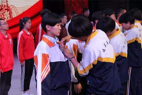 老团员为新团员佩戴团徽