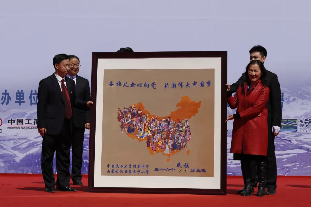启动仪式上,自治区党委副书记、自治区政府主席布小林,自治区政府副主席艾丽华,国家体育总局副局长高志丹,中央民族大学副校长、中央民族大学附属中学校长田林分别将印有“兴安红色研学”的旗帜,分别授予中央民族大学附属中学、兴安职业技术学院、乌兰浩特一中、乌兰浩特朝鲜族学校、乌兰浩特市第十二中学、乌兰浩特蒙古族小学。