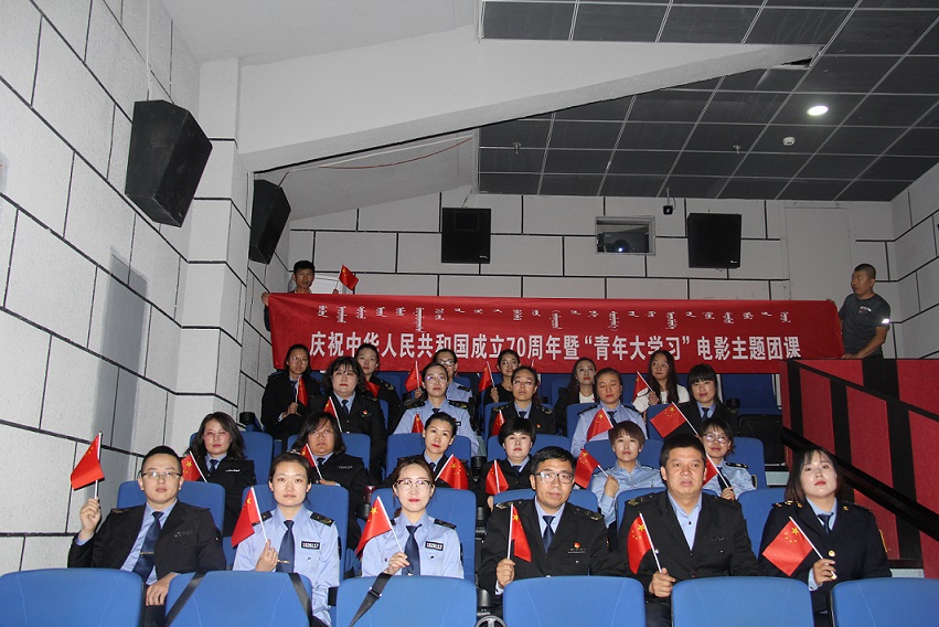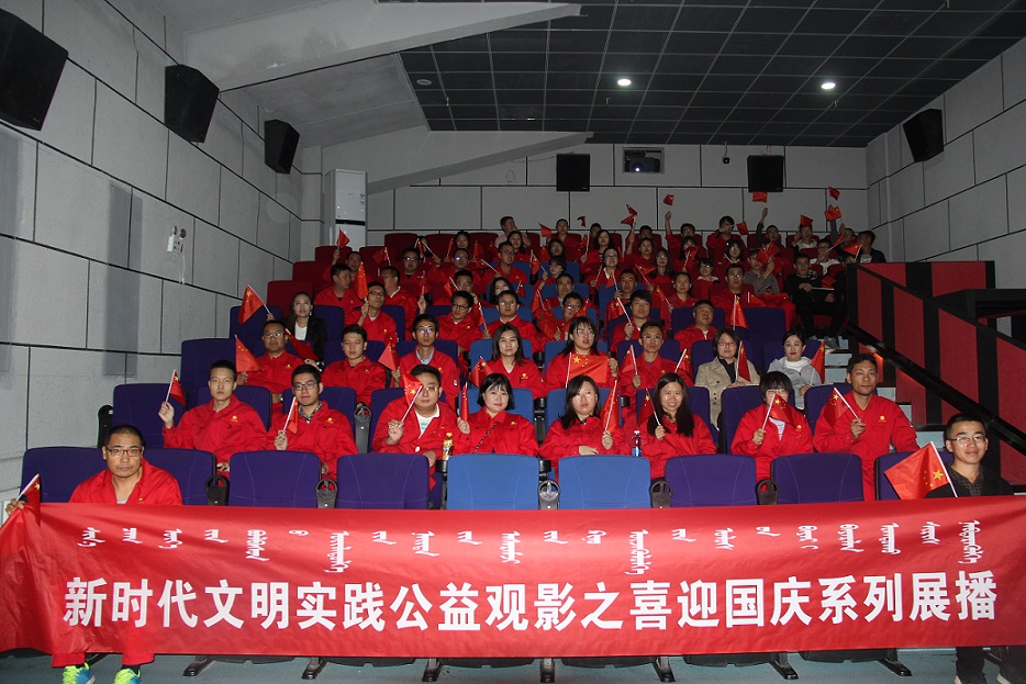 为庆祝中华人民共和国成立70周年,国庆节期间,乌审旗新时代文明实践公益观影喜迎国庆暨爱国主义教育专场准时开播,乌审旗“青年文明号”集体、驻地企业、机关事业单位近125人观看了国庆档主旋律影片《我和我的祖国》。