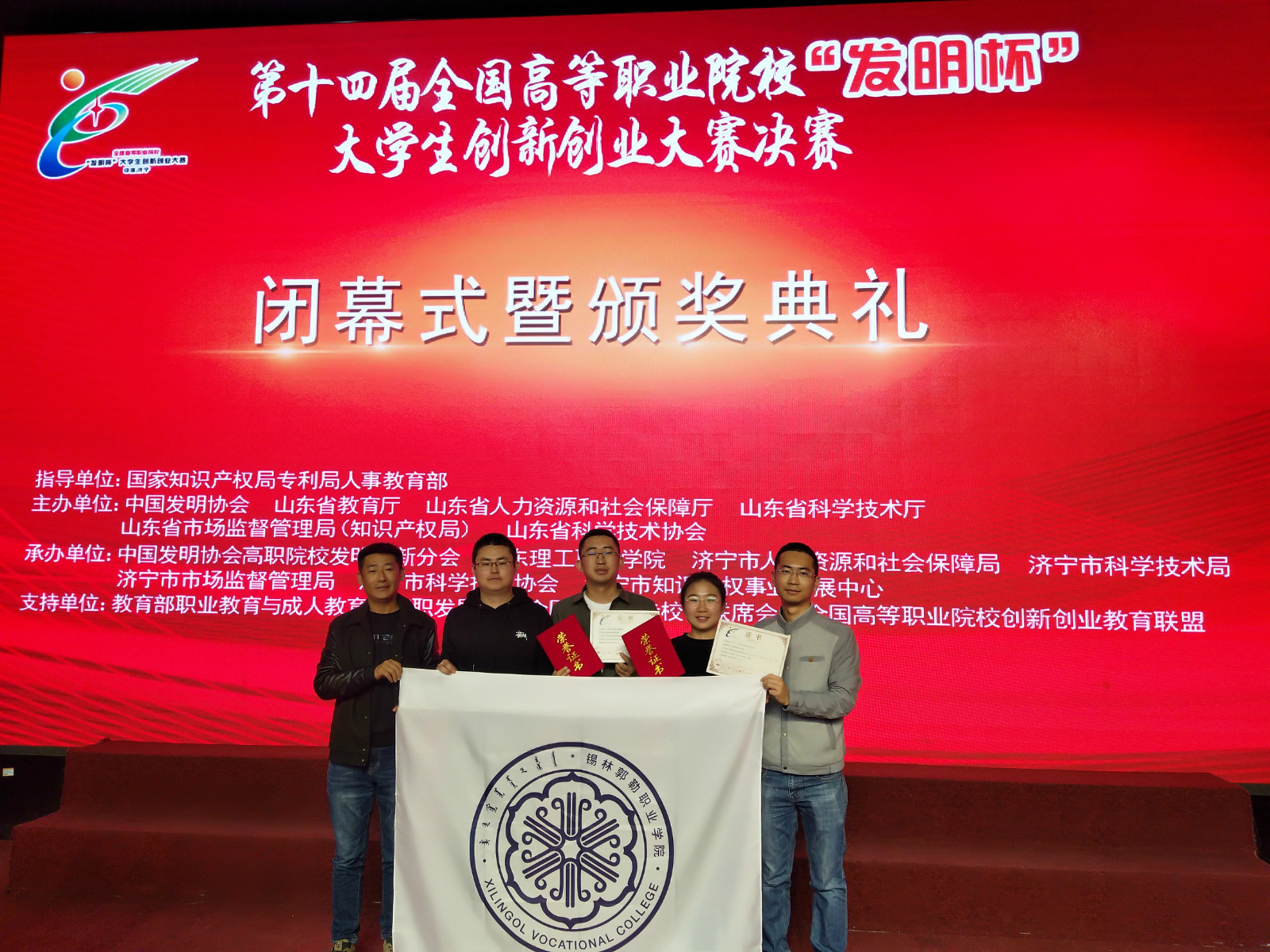 10月26日-27日,第十四届全国高等职业院校“发明杯”大学生创新创业大赛暨大学生知识产权培训在山东济宁隆重举行。我院申报的作品“9YY-Y-3型吊篮式牲畜药浴设备”(指导教师:那顺巴雅尔、王宝存)获发明制作类一等奖、“那日苏农牧业机械设备有限公司”(指导教师:王宝存、那顺巴雅尔)获创业类一等奖、“一种全自动吸尘黑板擦”(指导教师:李鹏耀、董立江)获发明制作类二等奖,那顺巴雅尔老师和王宝存老师荣获“优秀指导教师奖”。