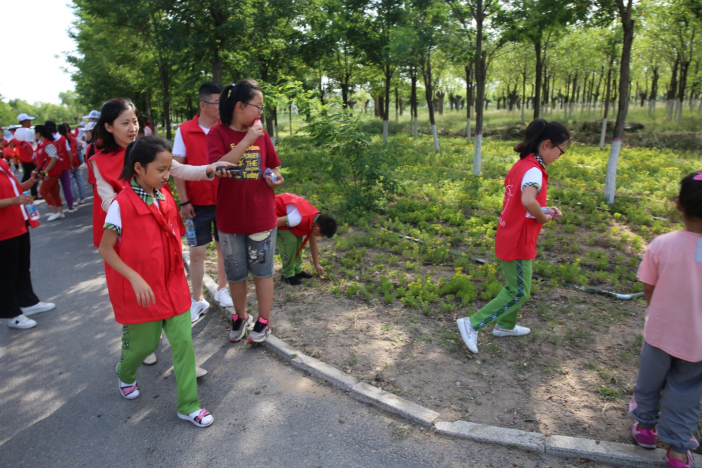 活动分为三个部分:创城公益徒步、拾捡周围垃圾、亲子趣味游戏。一大早,参加活动的师生和家长在森岭公园统一集合,详细介绍活动内容、行走路线以及活动过程中需注意的事项。活动正式开始,大家手举红旗、步调一致,彼此激励、欢声笑语,在实践中学习,在亲历中成长。娱乐活动时间,跳绳、跨格等亲子趣味游戏,不仅缓解了学生们近期学习、作业压力,更拉近了学生与同学、家长、老师的距离,达到了放松娱乐与团结协作的目的。在徒步与游戏过程中,大家沿着道路两侧,拾捡草坪和公路边的废纸、食品袋、塑料袋、饮料瓶等垃圾,并向过往行人宣传绿色出行、文明习惯、公共安全等方面的小知识。经过一上午的时间,徒步行走近十公里,捡得垃圾几十袋。